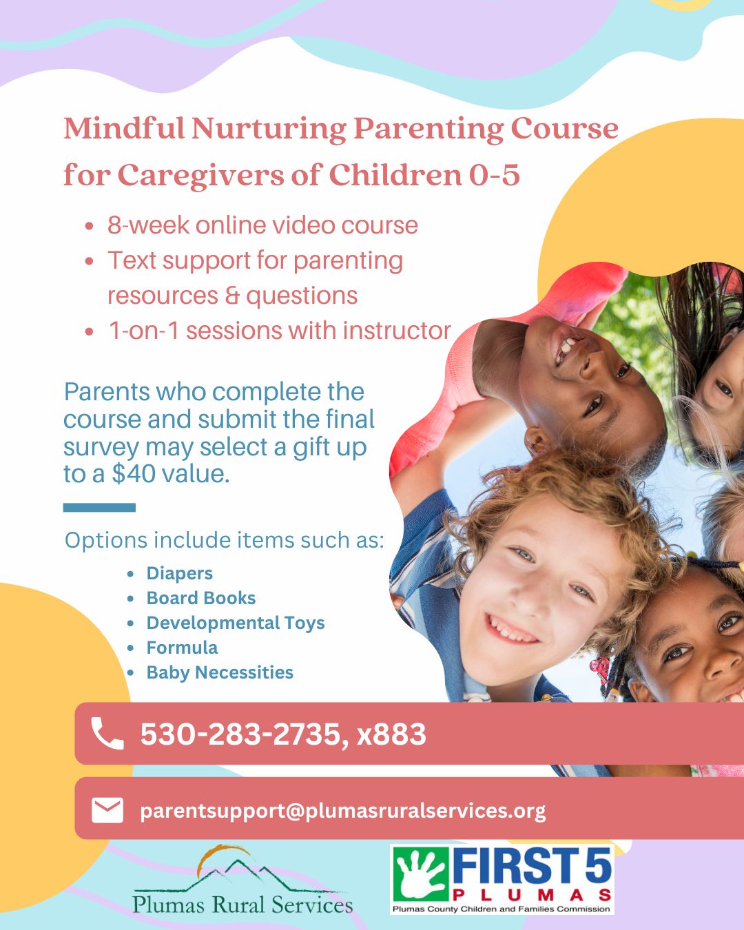 In collaboration with First Five of Plumas County, our Mindfulness Living Coordinator, Leslie Wall has prepared a series of eight videos to assist parents raising children. Select "More Info" below to learn about additional incentive items to be given to those who watch the whole series.